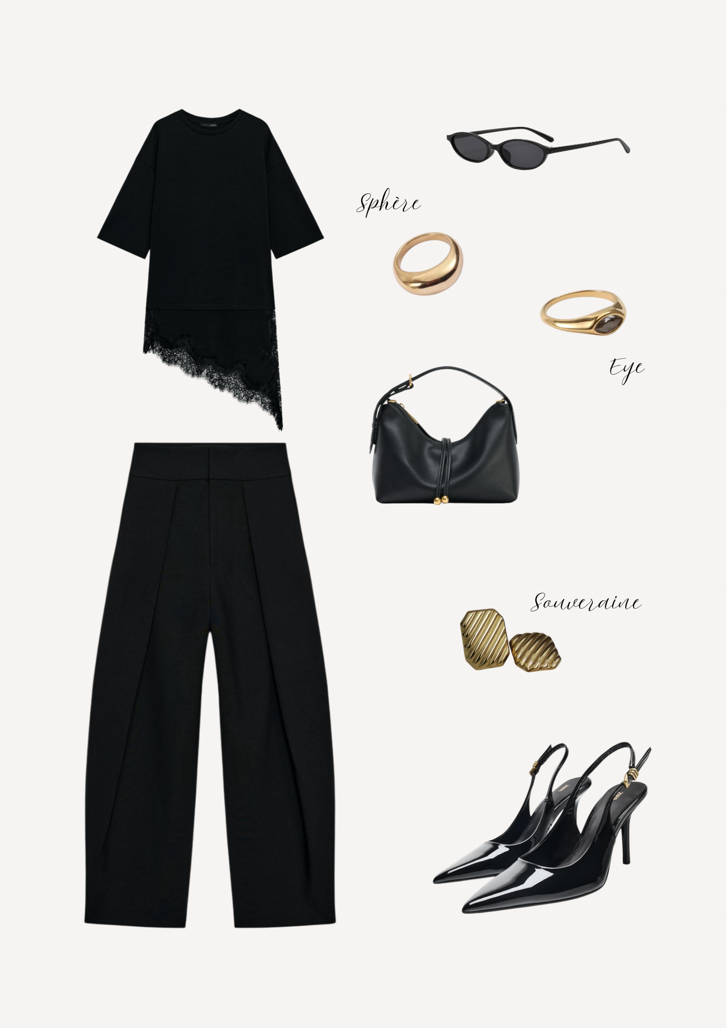 Des lignes nettes, du noir profond, relevés par des bijoux dorés qui captent la lumière. Des pièces pensées pour accompagner chaque mouvement, du quotidien aux moments clés.