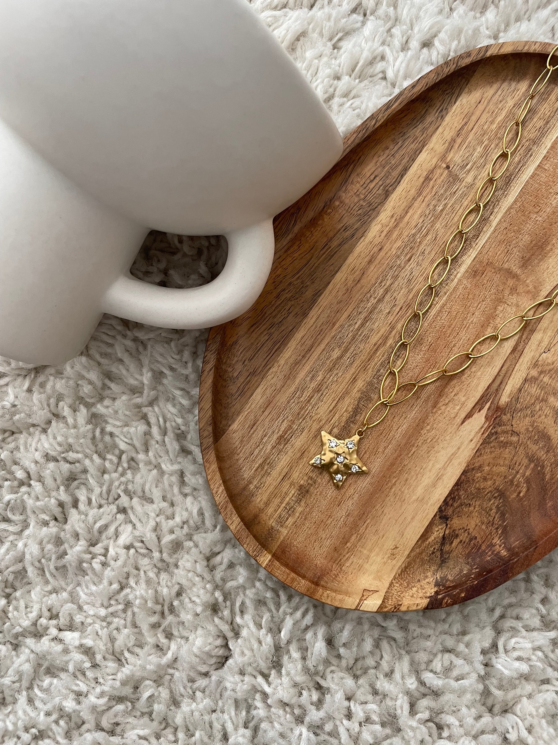 Sa chaîne ovale au design élégant offre un tombé parfait sur le buste, sublimant vos tenues d’été, qu’elles soient bohèmes, minimalistes ou habillées. Le pendentif étoile, martelé pour un effet texturé unique, reflète la lumière de façon scintillante grâce à ses strass délicats. Ce bijou solaire et tendance est idéal pour accessoiriser une robe fluide, un caraco en lin ou une chemise oversize.
