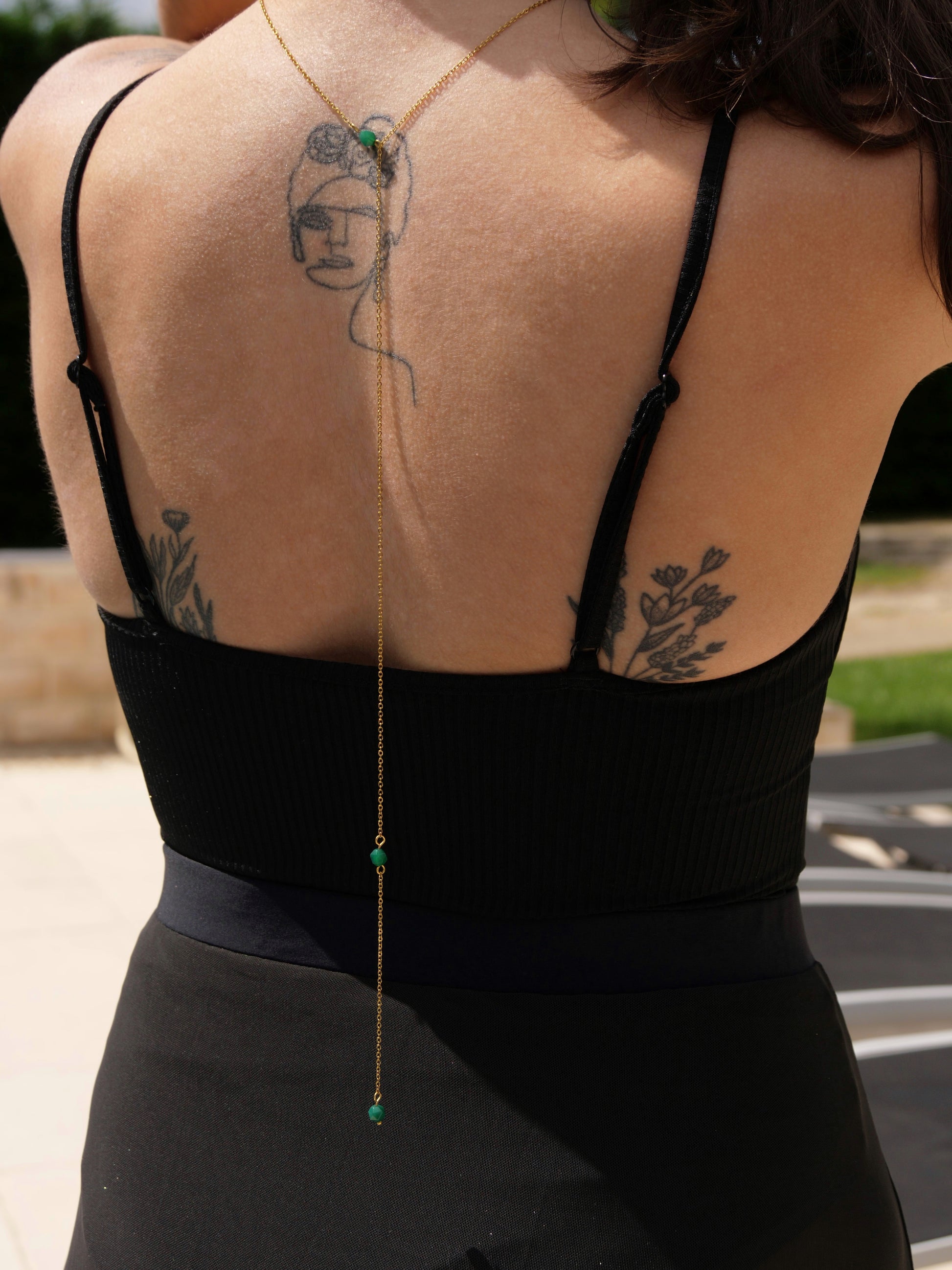 Le bijoux de corps ALBA est en acier inxoydable doré. Vous ne pouvez passer à côté des bijoux de corps pour cet été. Vous avez aimé le sautoir élégance ? Vous adorerez ALBA, sublimé de pierres en agate verte, d’un vert éclatant au contact du soleil. Osez et soyez la plus rayonnante sur la plage cet été ! ALBA se porte également dans le dos, un bijoux de corps 2 en 1 qui saura en ravir plus d’une. Son système coulissant vous permet de l’enfiler sans fermoir et de régler sa longueur à votre guise, INCROYABLE non ?  Il est résistant à l’eau ainsi qu’à tous vos gestes du quotidien.