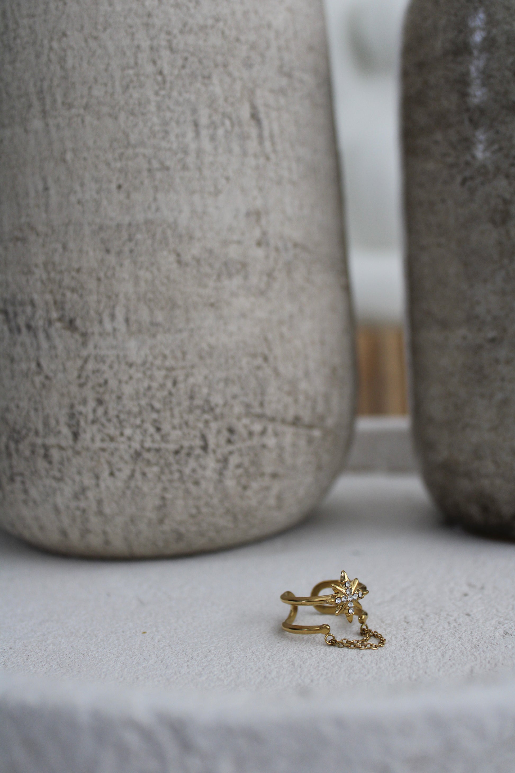 Cette bague réglable en acier inoxydable doré ou argenté allie élégance et originalité. Composée de deux rangs distincts, l’un orné d’une étoile sertie de strass et l’autre décoré d’une délicate double chaîne qui pend, elle crée un effet unique et raffiné.