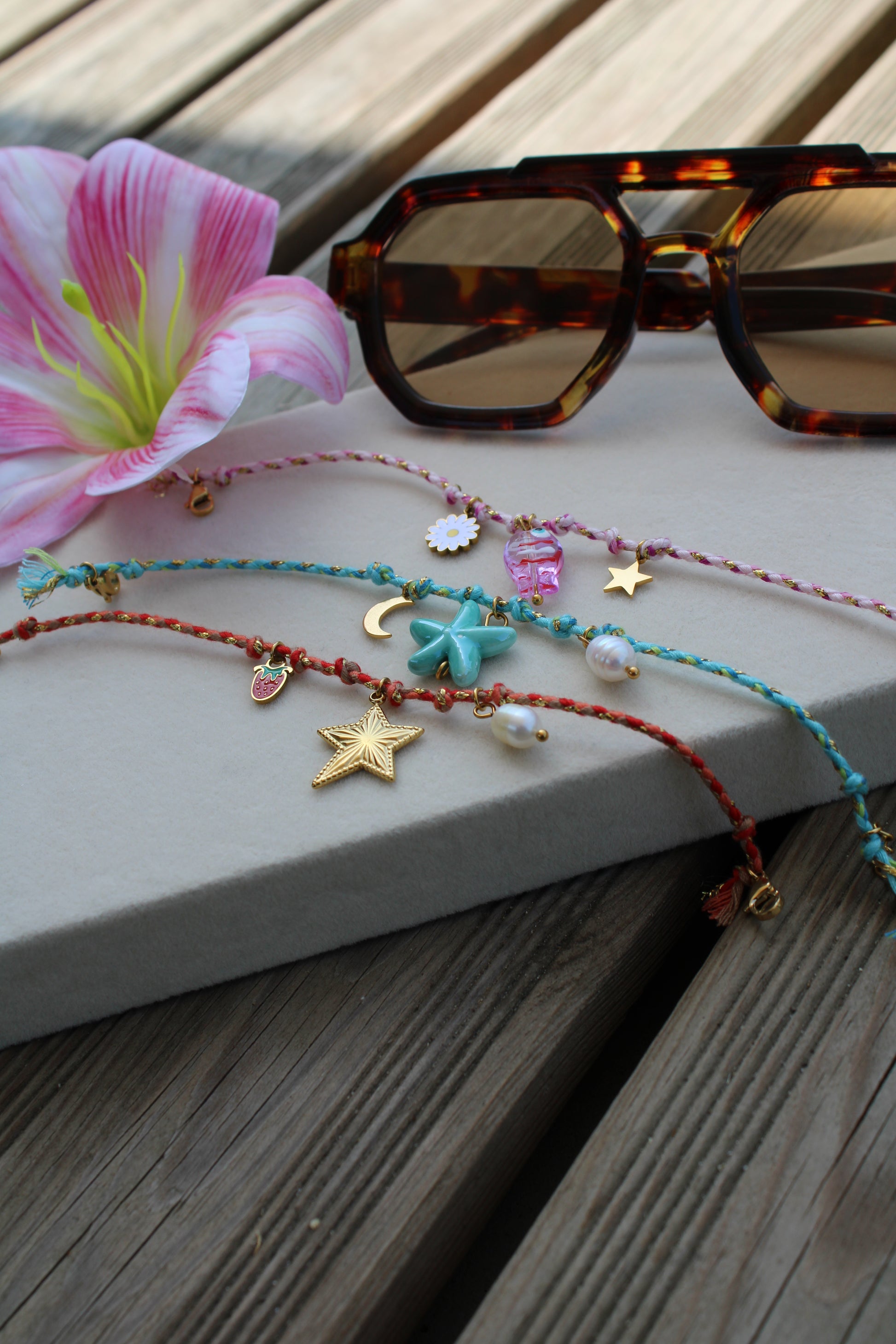 Ajoutez une touche de fraîcheur à votre look avec ce bracelet breloques en acier inoxydable doré. Sublimé d’un cordon bleu, vert et doré, il est orné de trois charms : une lune, une étoile de mer turquoise et une perle d’eau douce. Résistant à l’eau et à la vie quotidienne, ce bracelet allie durabilité et style bohème chic.