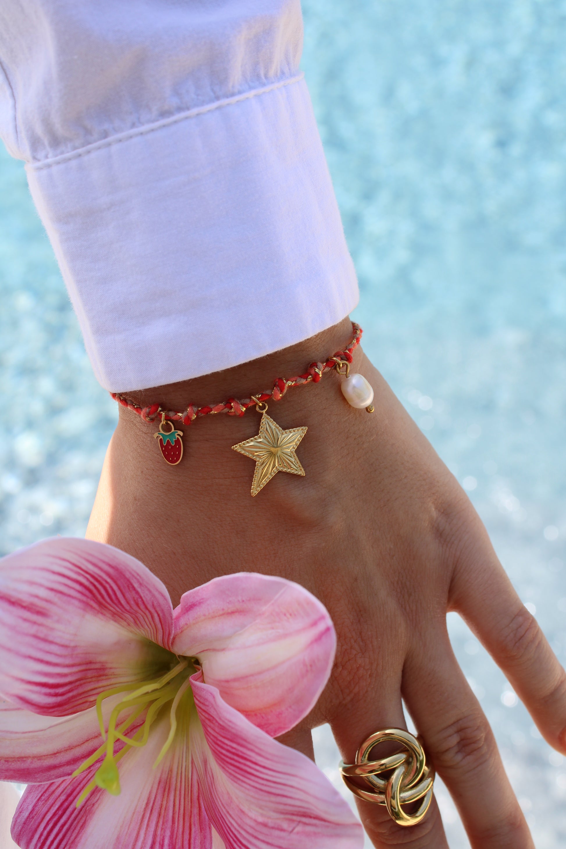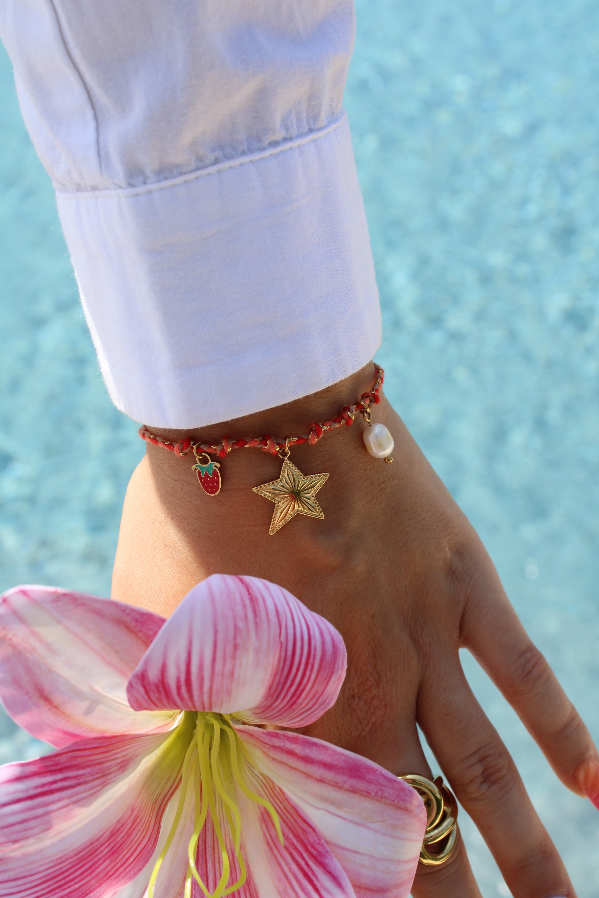 Ajoutez une touche de fraîcheur à votre look avec ce bracelet breloques en acier inoxydable doré. Sublimé d’un cordon rouge, beige et doré, il est orné de trois charms : une fraise, une étoile ornée de détails et une perle d’eau douce. Résistant à l’eau et à la vie quotidienne, ce bracelet allie durabilité et style bohème chic.