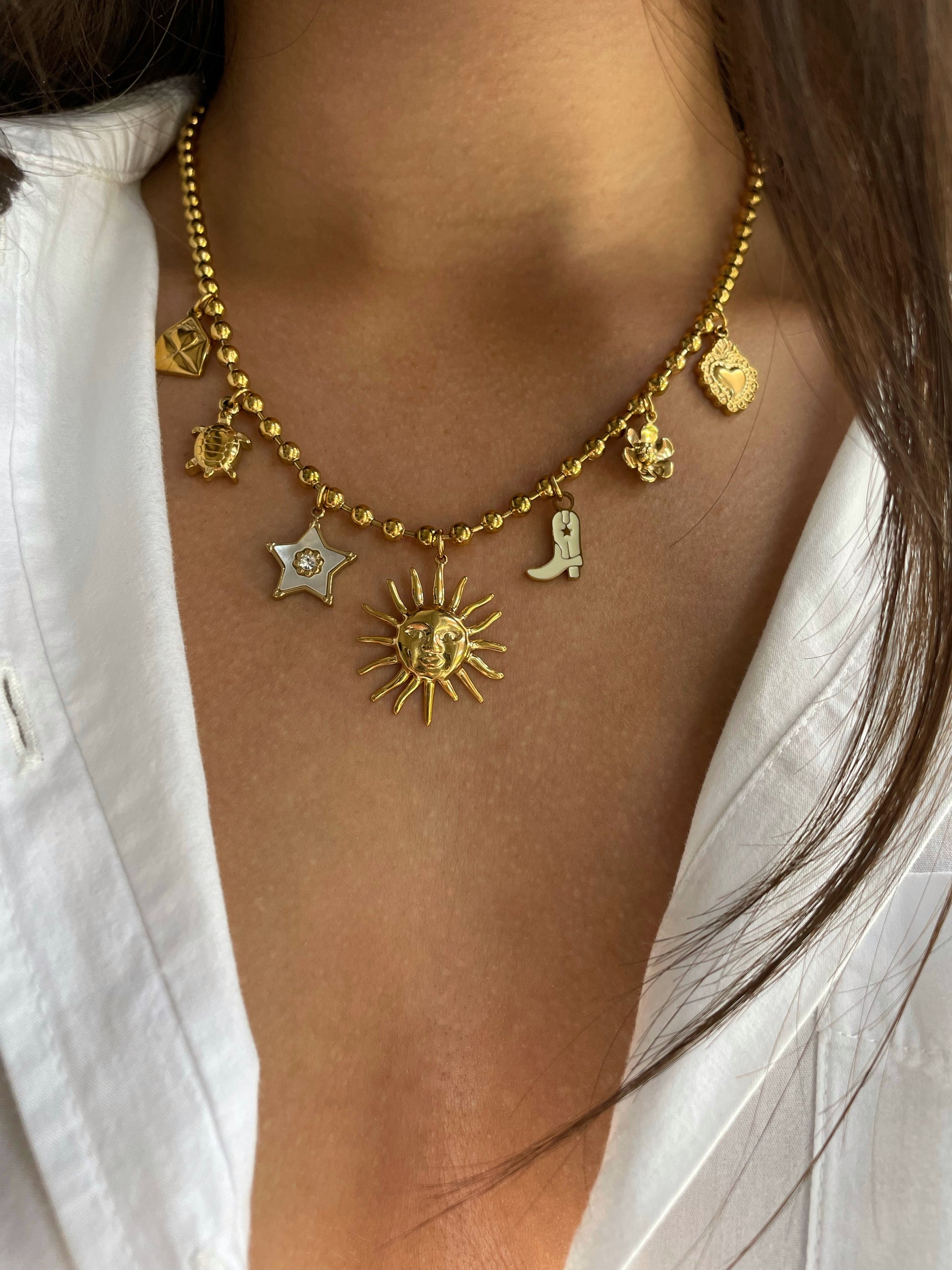 Sélectionne 5, 7 ou 9 breloques de ton choix à accrocher sur ton collier en acier inoxydable doré, et reçois un bijou unique, rempli de sens et résistant à l’eau !