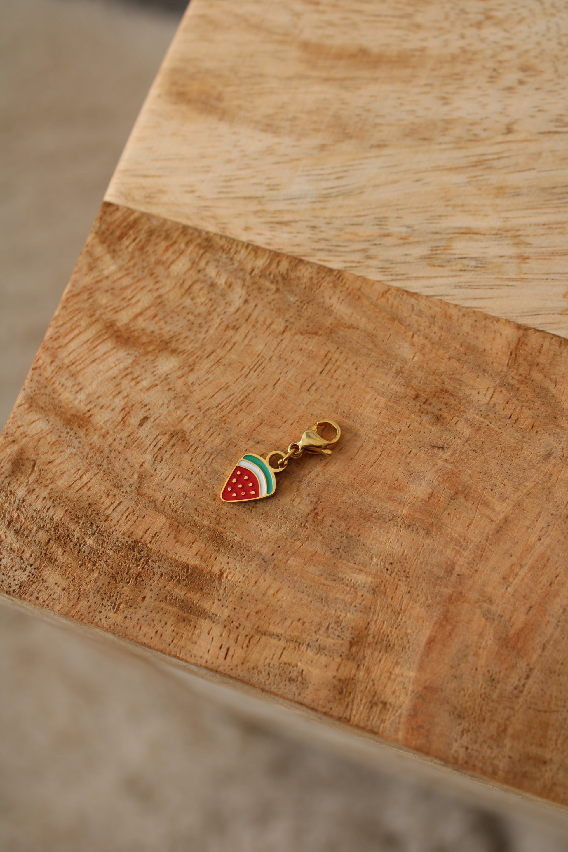 Charm pastèque en acier inoxydable doré. Son fermoir pratique permet de l’accrocher facilement sur un collier ou un bracelet, et de l’enlever à votre guise.