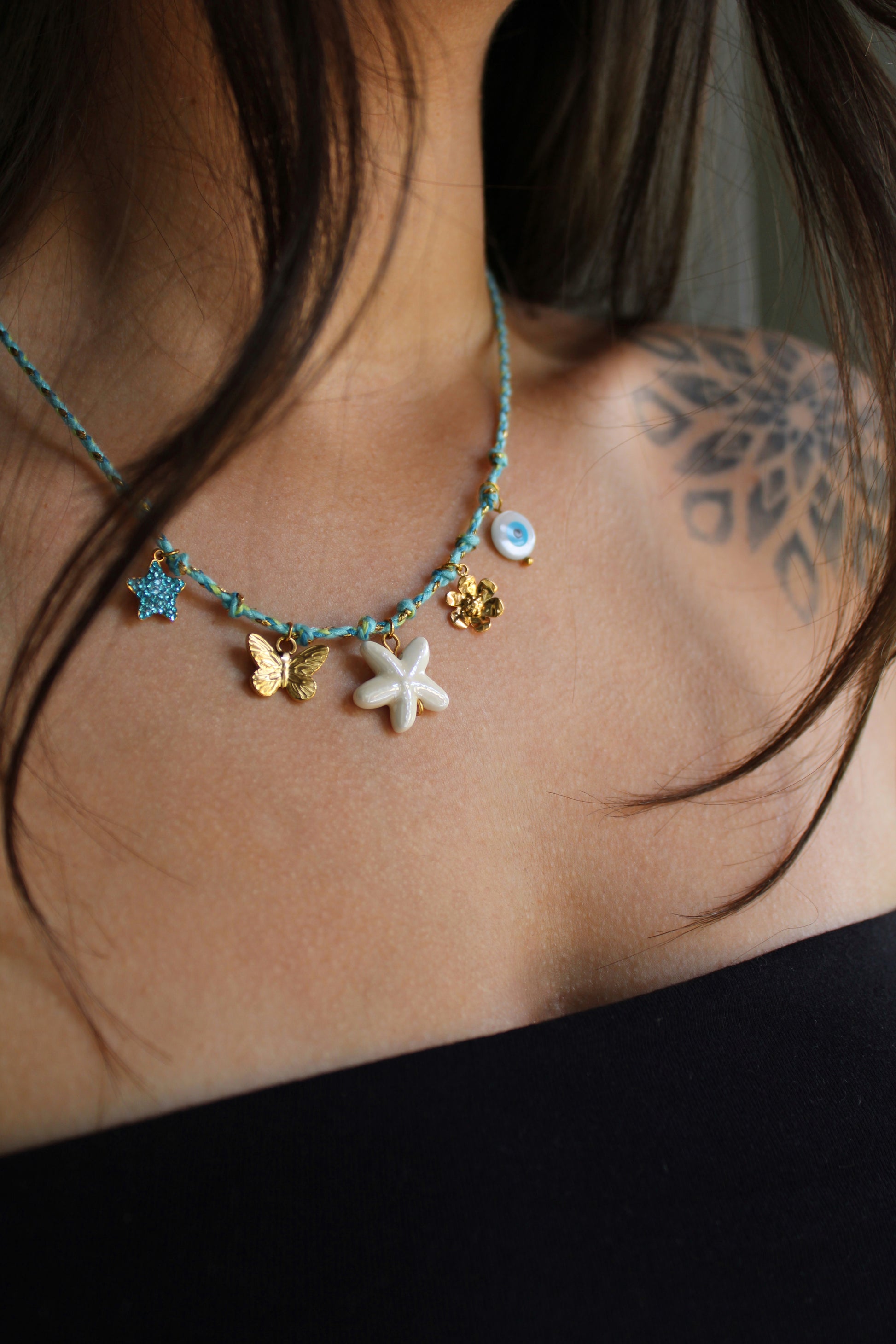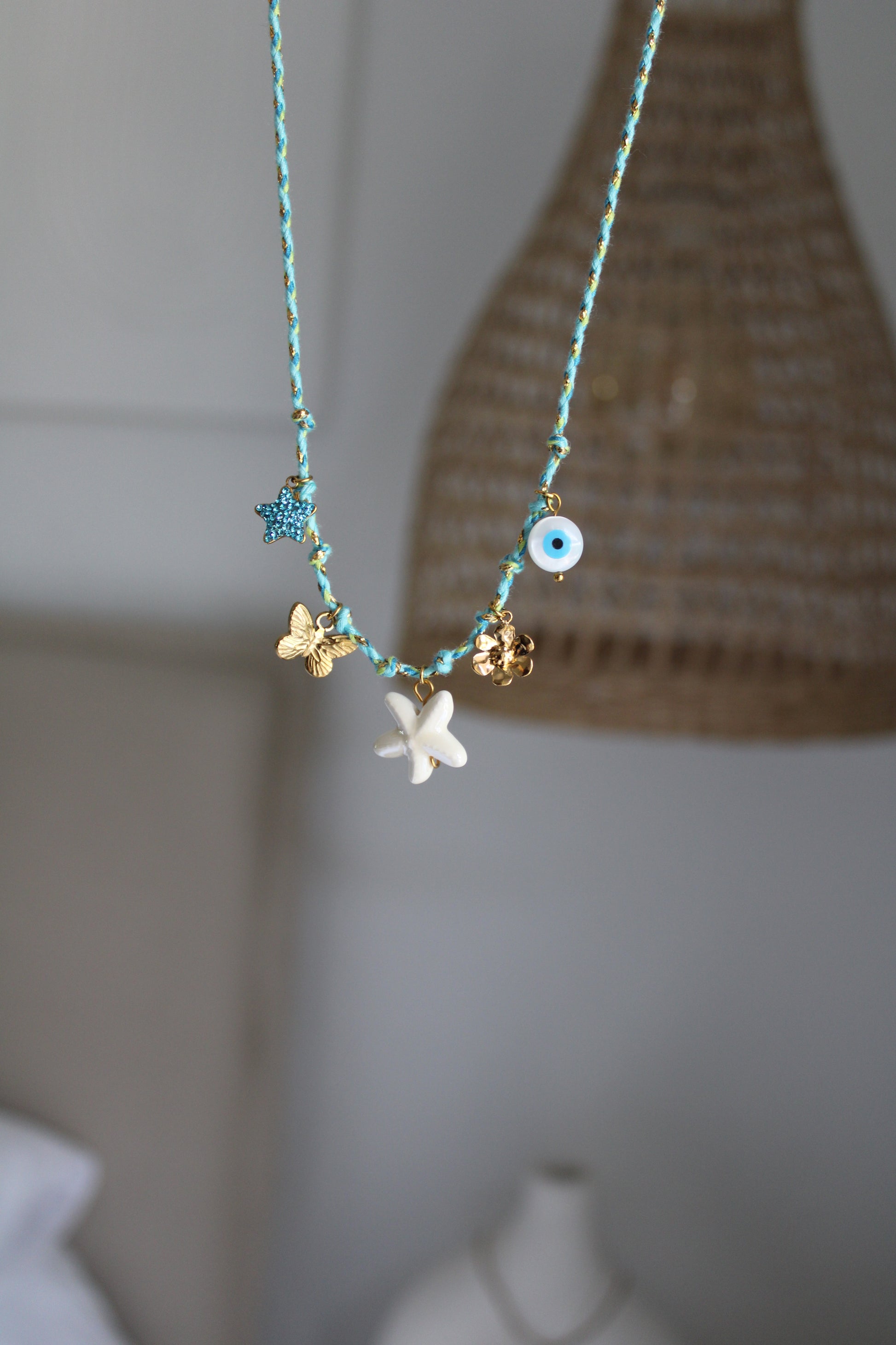 Laissez la magie de l’été vous envelopper avec ce collier bohème en cordon turquoise et acier inoxydable doré, orné de charms dorés et nacrés inspirés de l’océan. Composé d’une étoile de mer en céramique, d’un papillon doré, d’une fleur, d’une étoile strass et d’un œil protecteur nacré, ce collier est une ode à la liberté, à la légèreté et aux beaux jours.