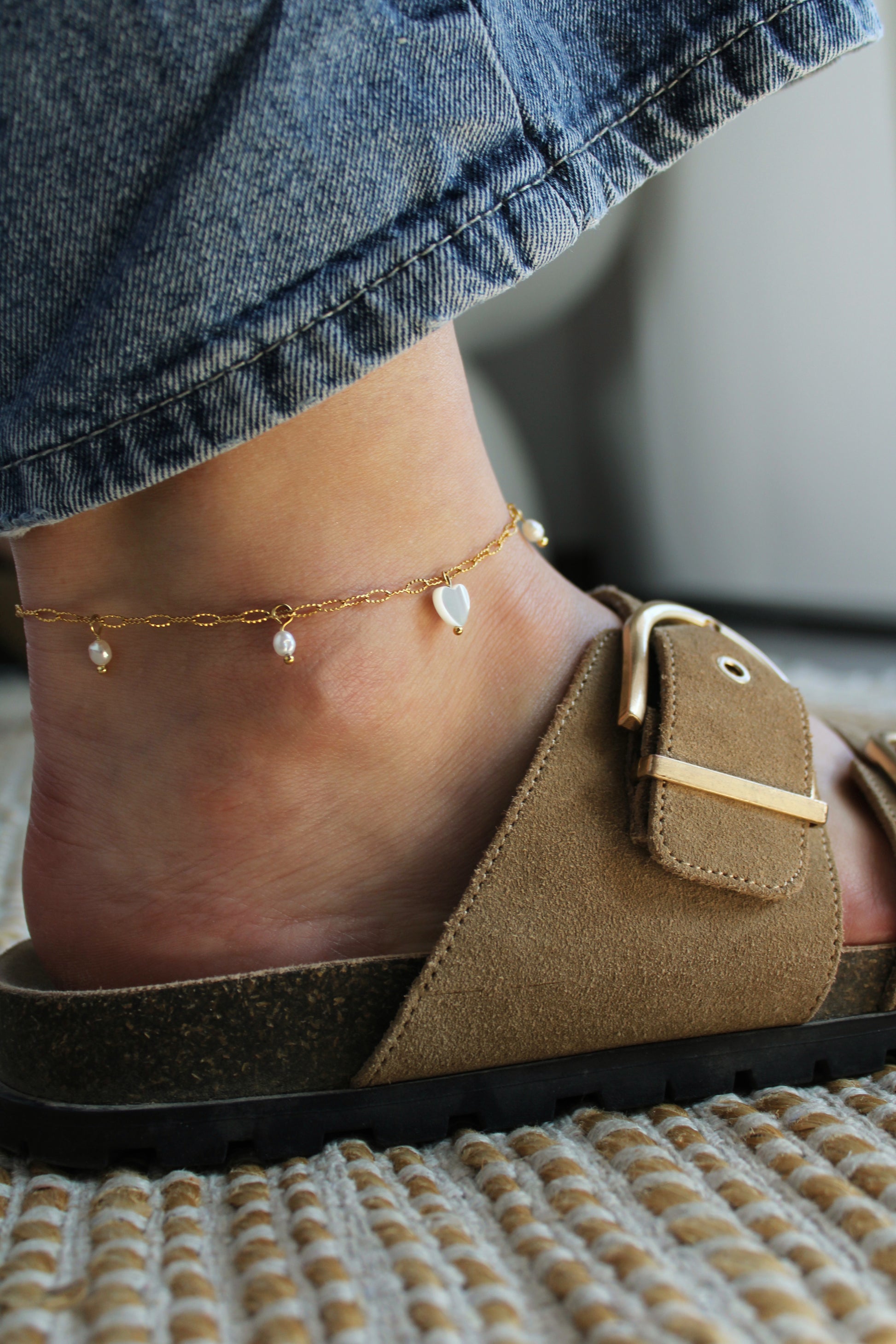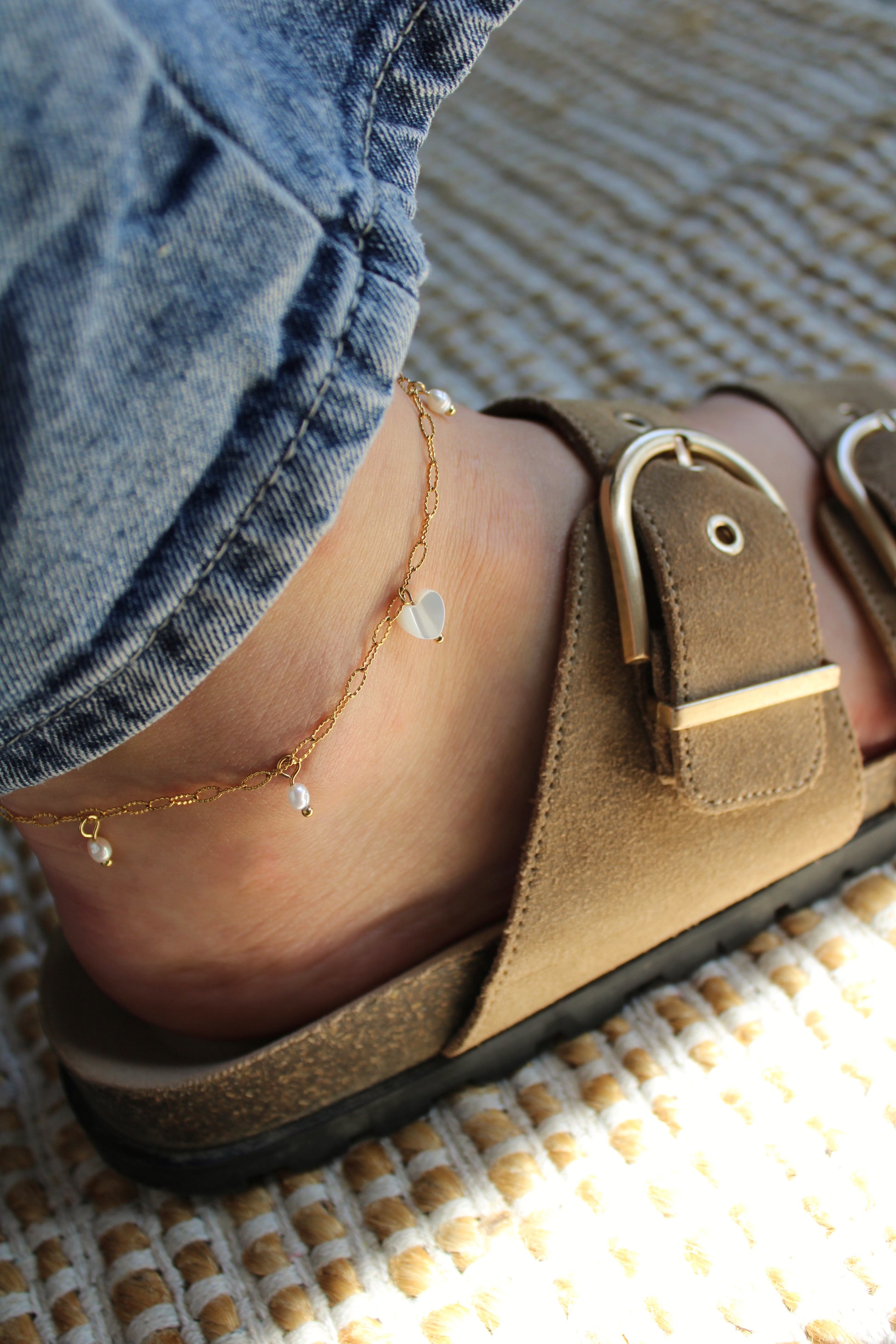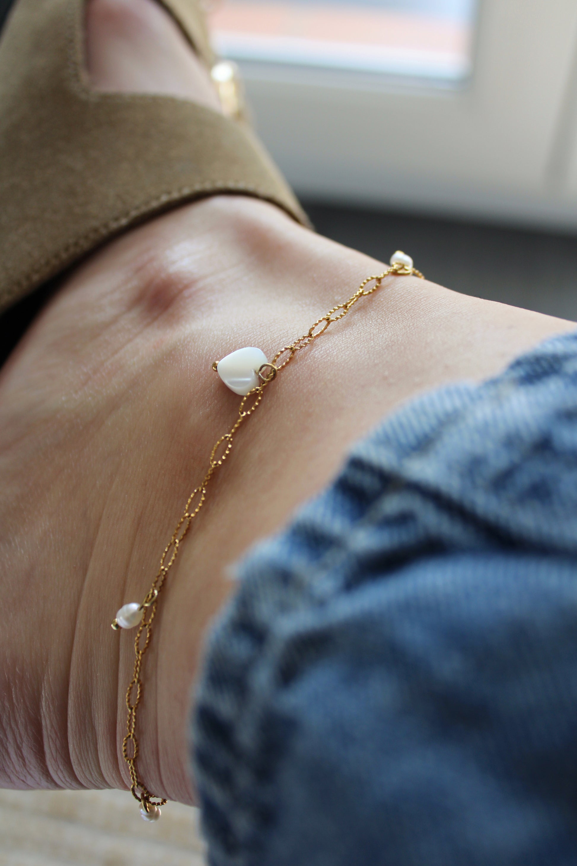 Un bijou délicat avec une fine chaîne ovale striée en acier inoxydable doré, sublimé par des perles d’eau douce et un cœur en nacre naturelle. Résistant à l’eau, parfait pour rayonner tout l’été.