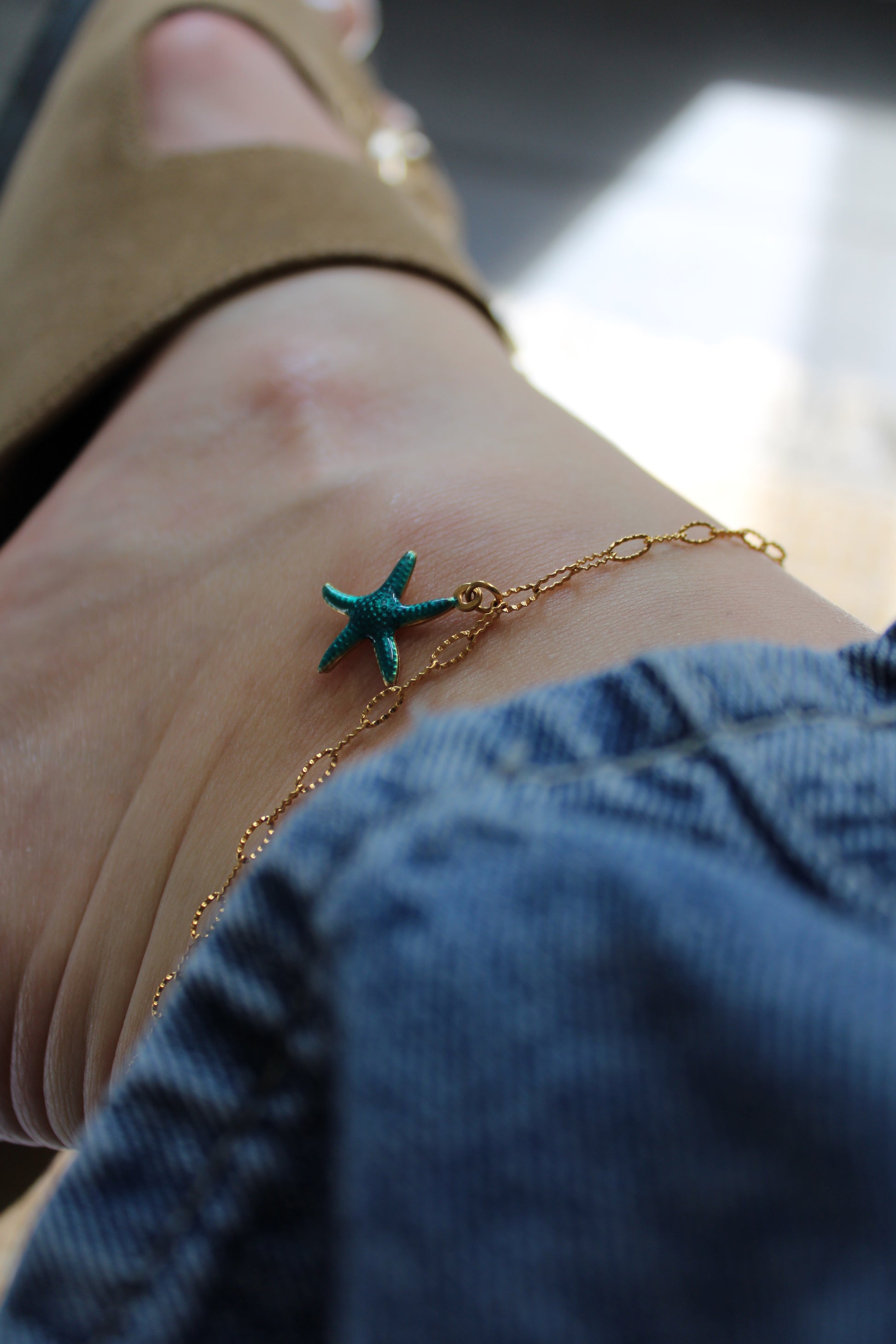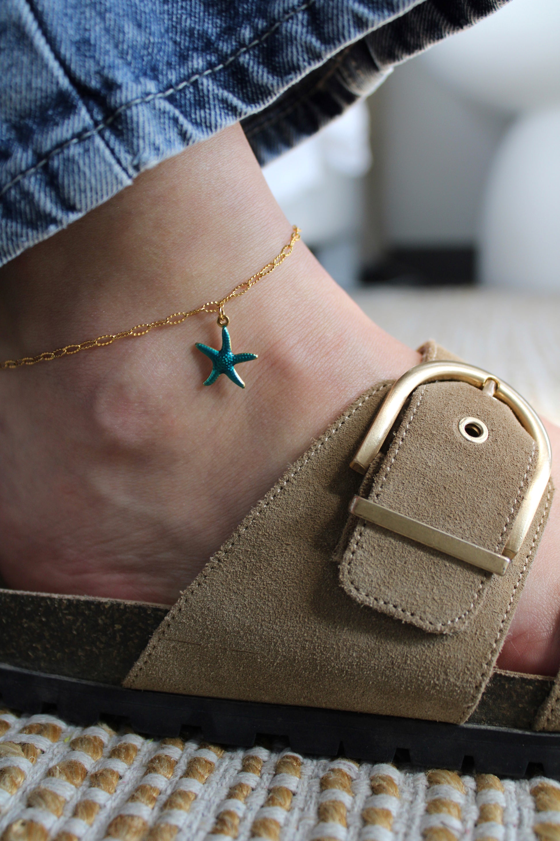 Bracelet de cheville doré, délicatement orné d’une fine chaîne ovale striée et sublimé d’une étoile de mer turquoise. Résistant à l’eau, il apporte une touche légère et solaire à vos journées d’été.