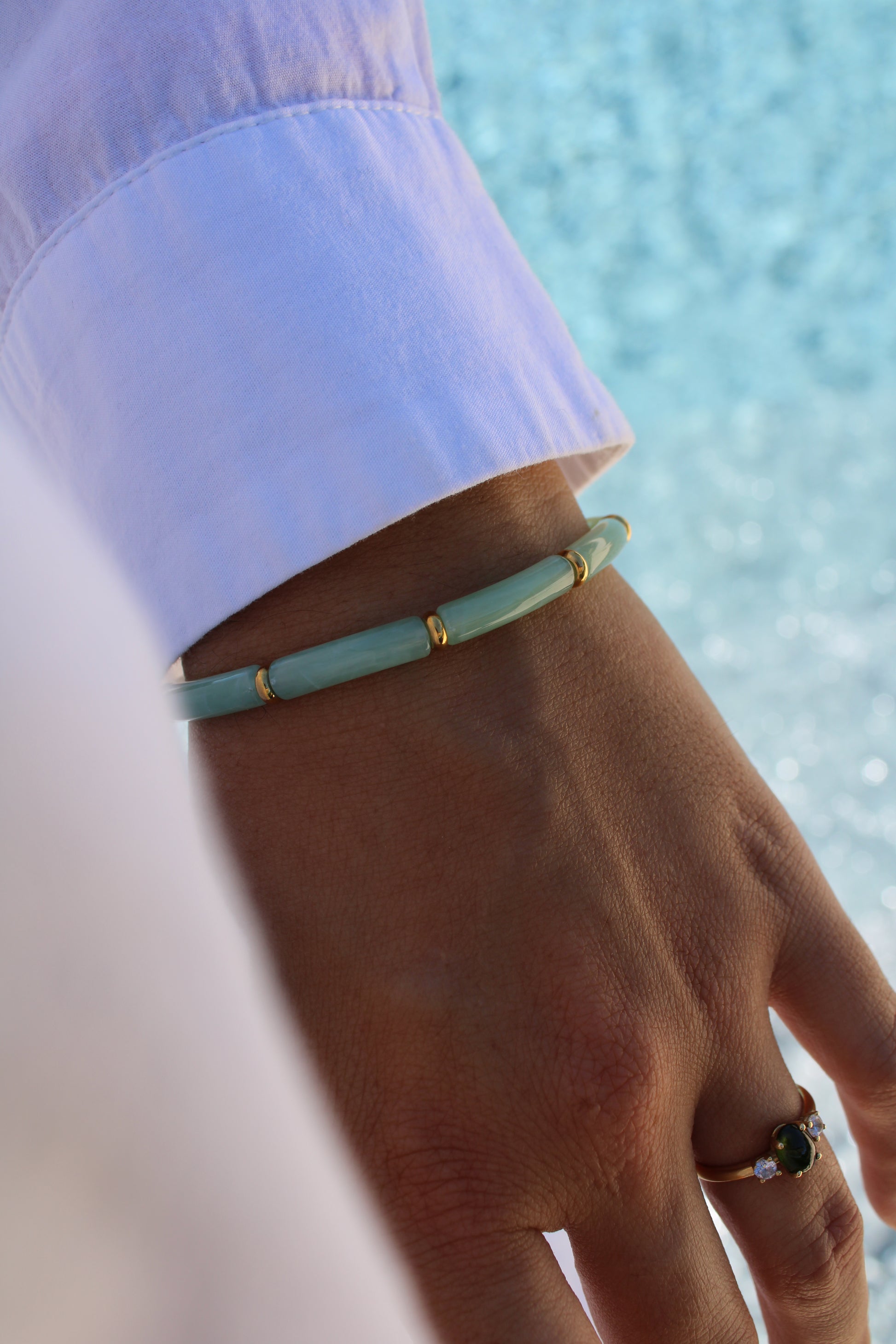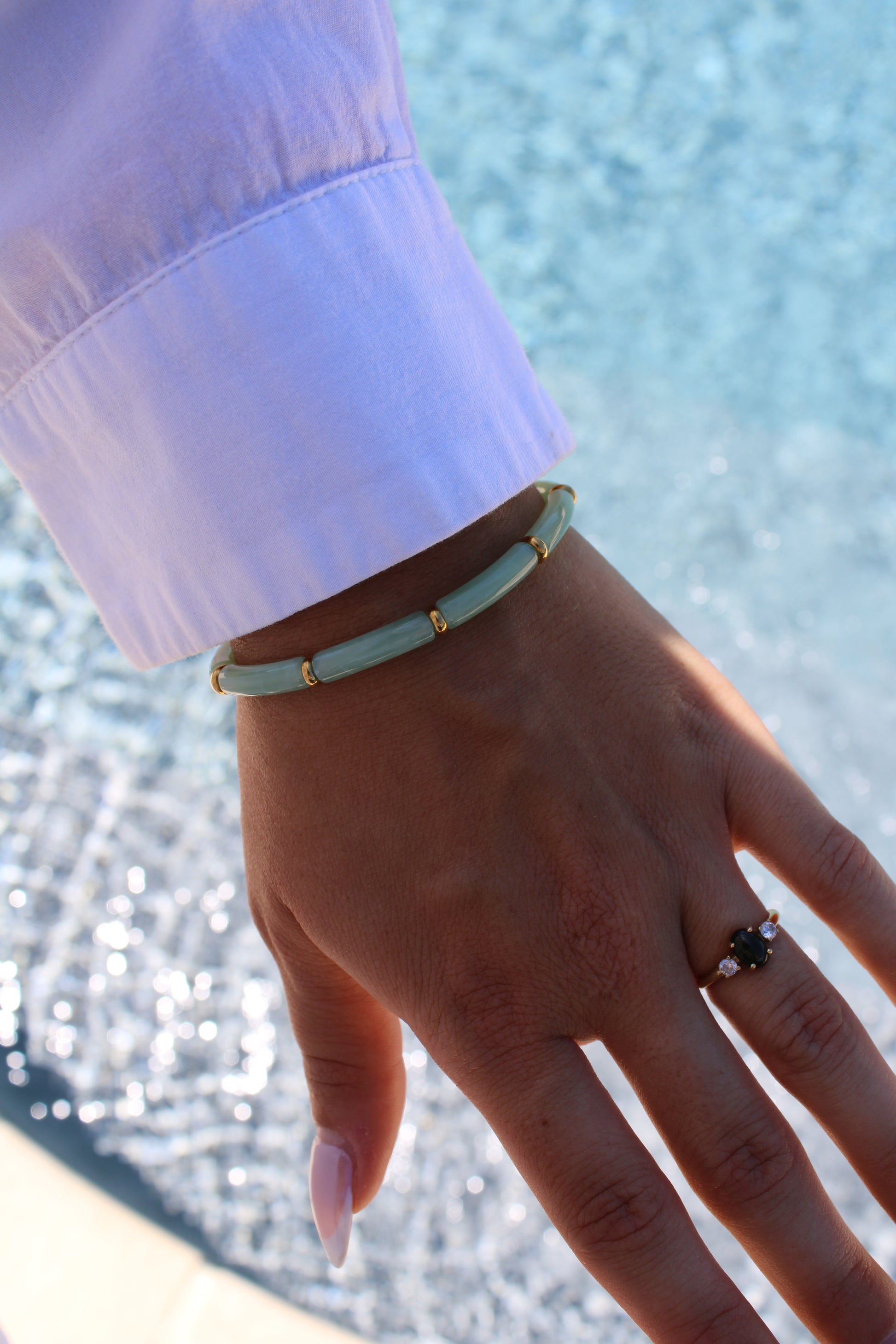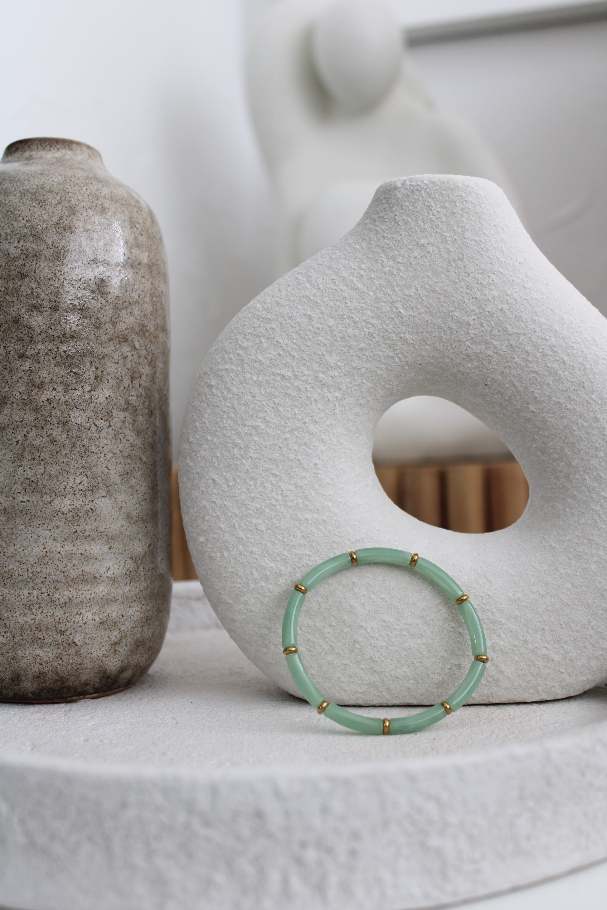 Bracelet élastique orné de perles acryliques vert translucide, sublimé par des perles en acier inoxydable doré. Résistant à l’eau et extensible, il offre une touche de fraîcheur et d’élégance naturelle.