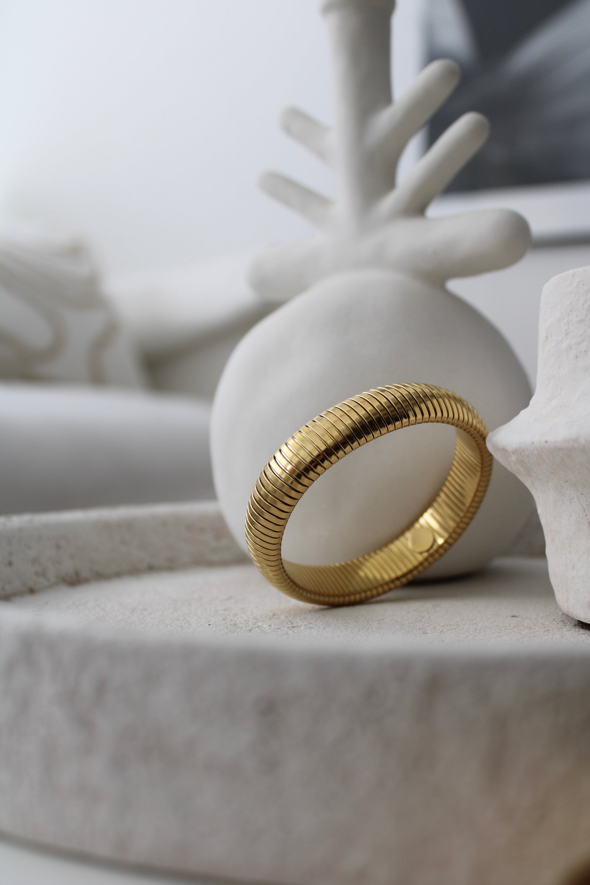 Cette manchette striée en acier inoxydable, disponible en doré ou argenté, est une pièce élégante et légère à porter. Son design moderne, avec des lignes striées délicates, allie sophistication et confort.