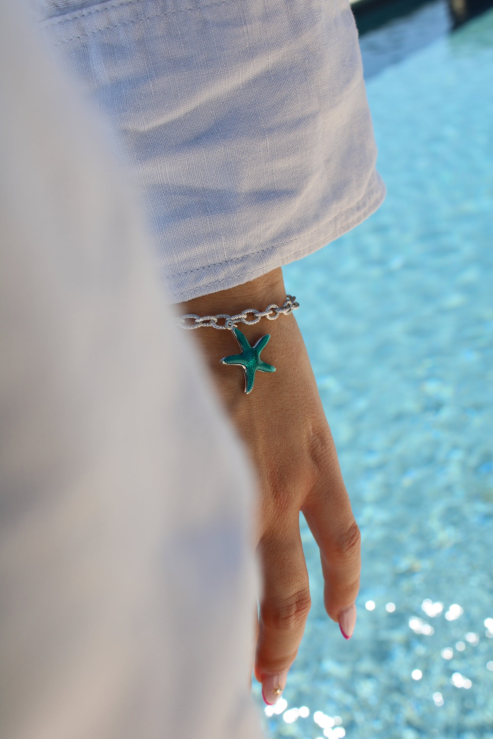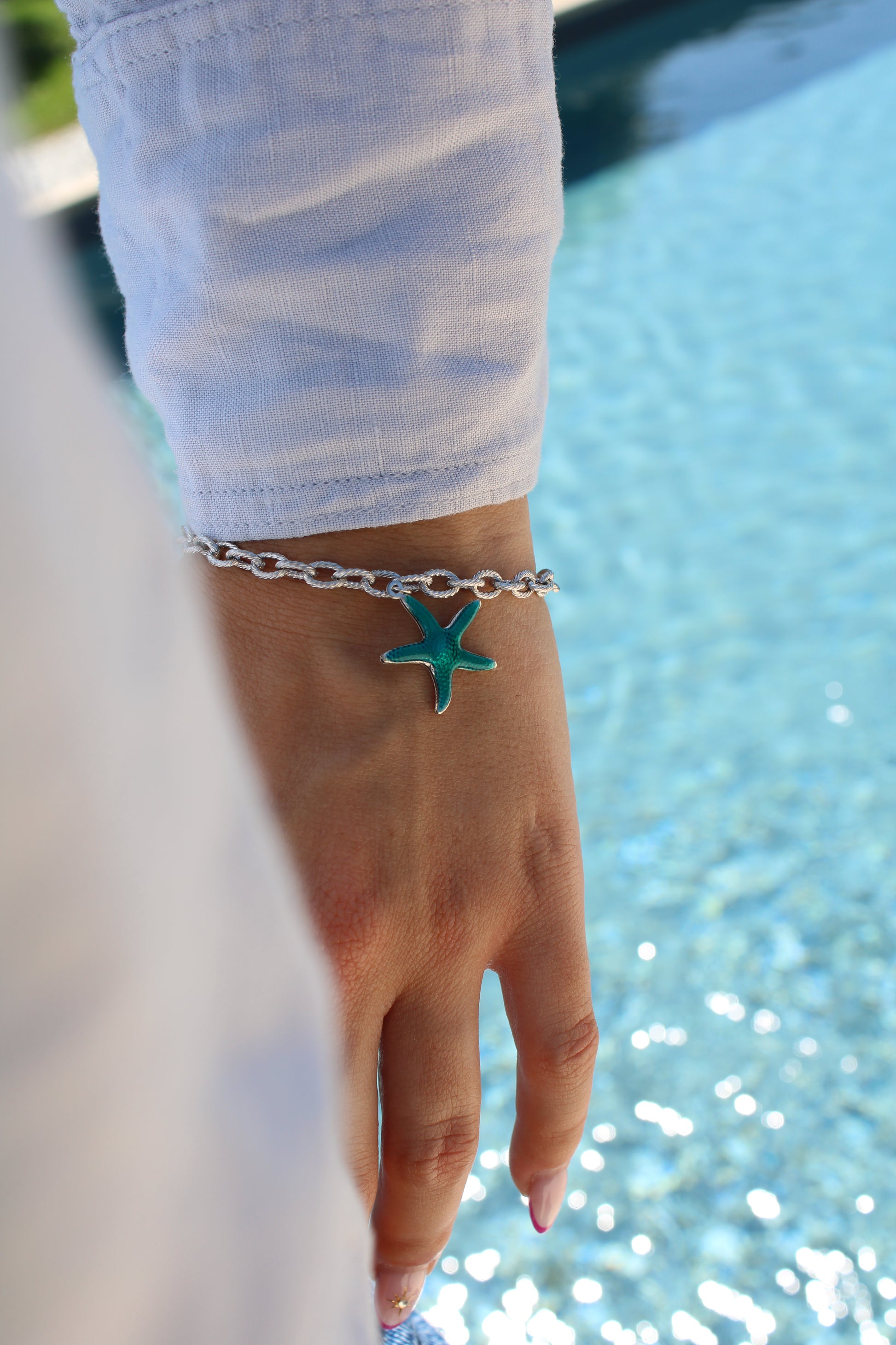 Ce bracelet s’inspire de l’univers de la mer pour sublimer votre poignet avec finesse et originalité. Le design texturé de la chaîne ajoute du caractère, tandis que le pendentif étoile de mer évoque les vacances, la plage et l’été éternel.
