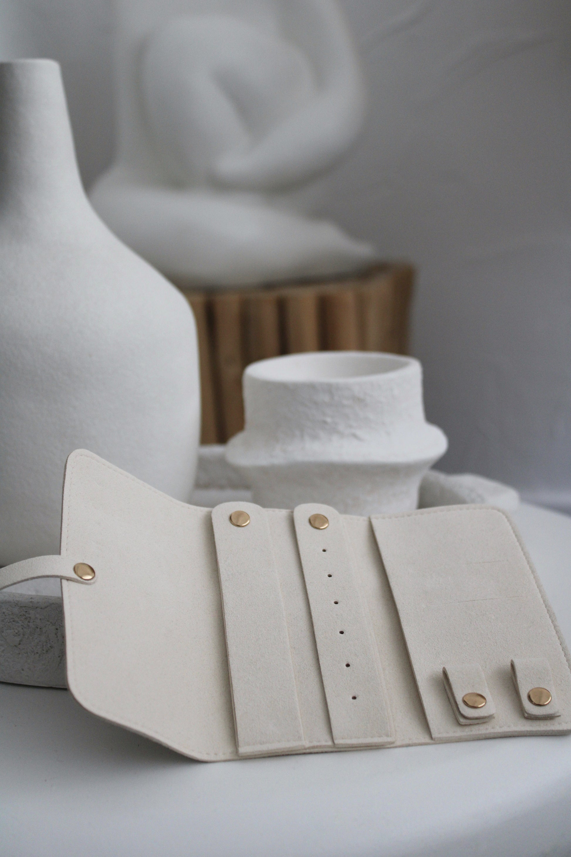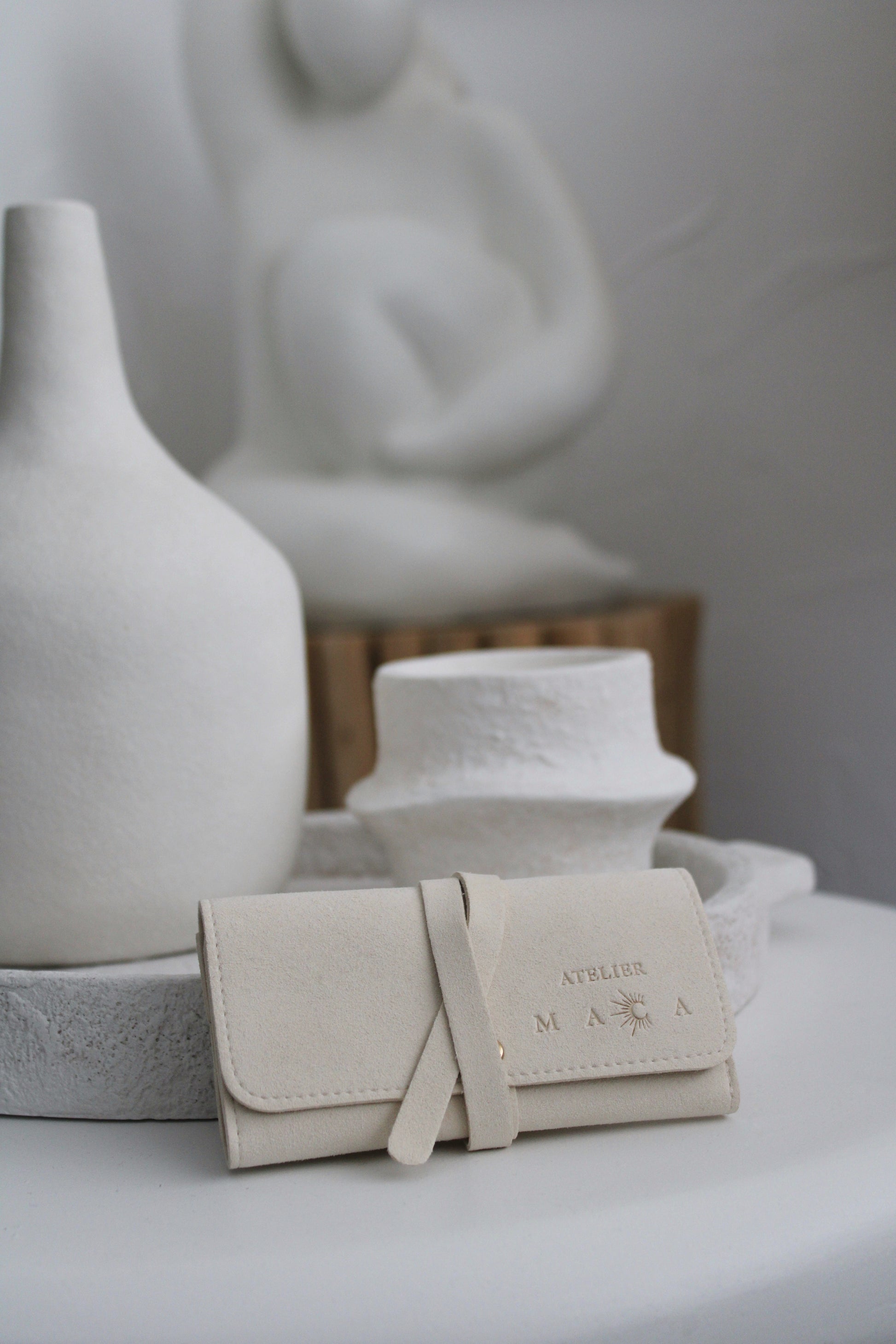 Optez pour cette élégante pochette de rangement en suédine beige, idéale pour organiser et protéger vos bijoux. Avec son design épuré et sa texture douce au toucher, elle allie fonctionnalité et raffinement.